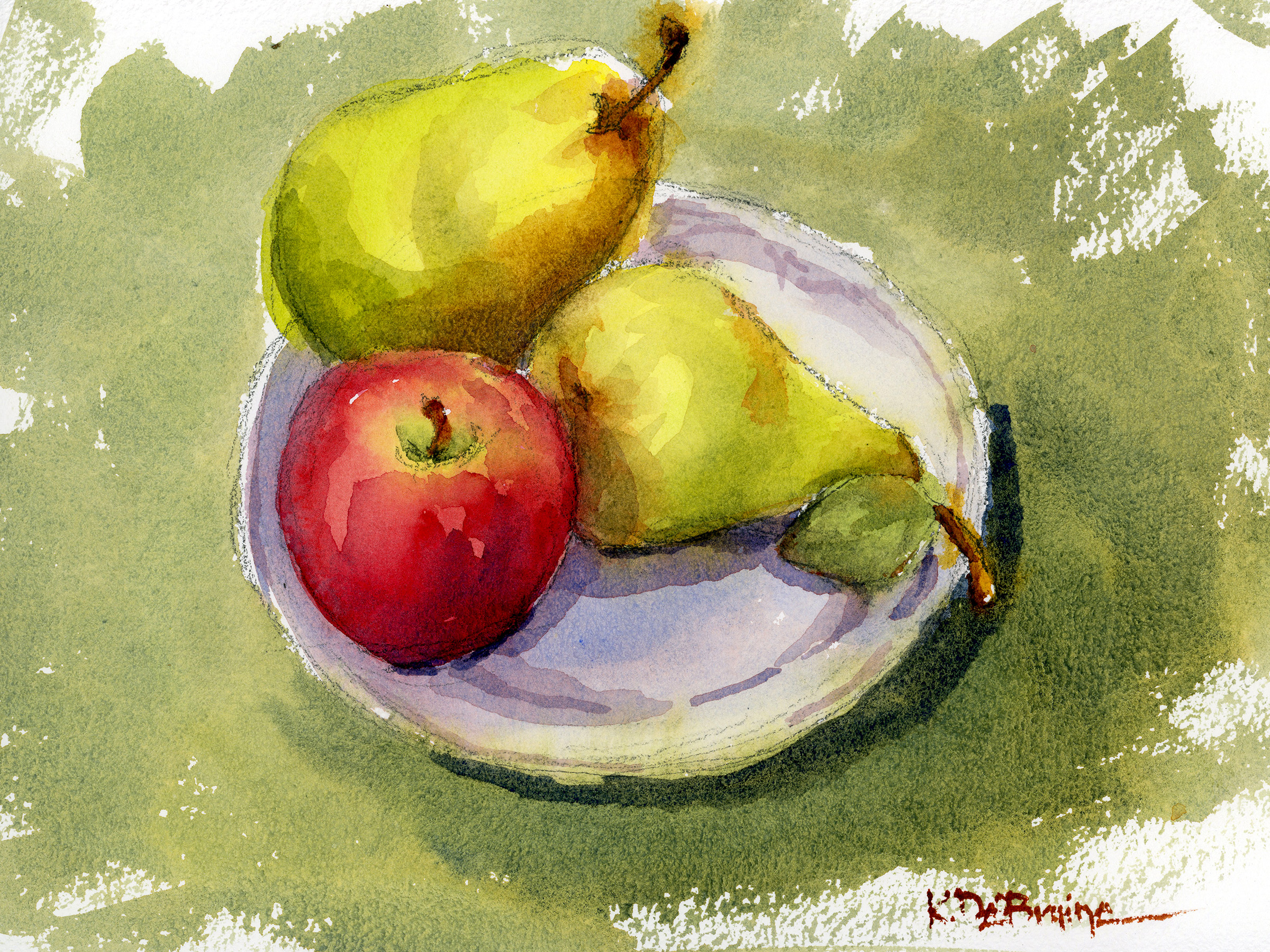 Watercolor still life of apple and pears with strong complementary color scheme of red and greens.