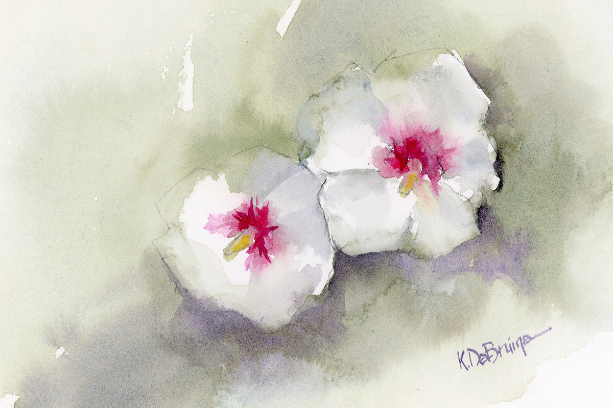 Two white hibiscus “Rose of Sharon” blooms with bright red centers and delicate white petals. The flowers are set in a muted green and violet background.  The flower represents love, beauty and healing.