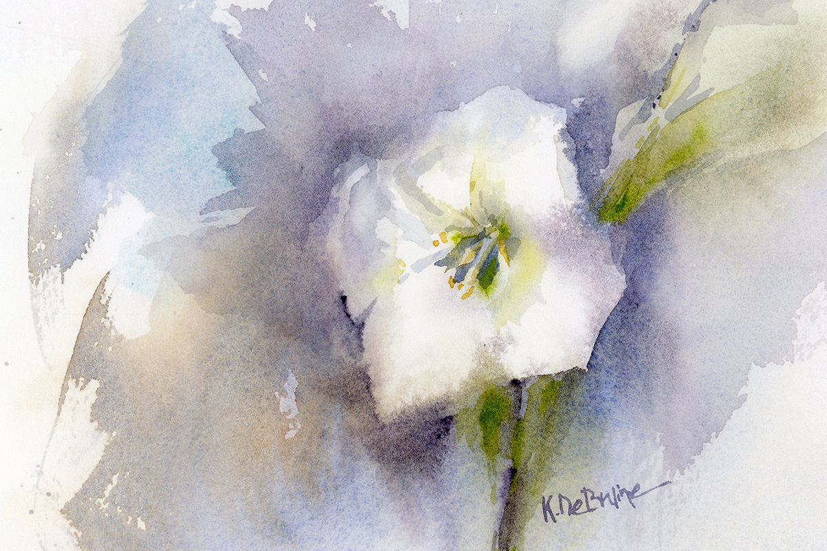 A single white lily on a muted violet, ochre and green background. The lily can represent purity, commitment and rebirth.